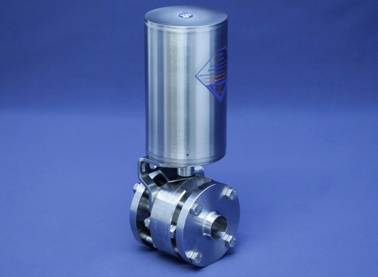 - Van bi khí nén kết nối mặt bích DN 65, inox 316L, bề mặt trơn, bộ truyền động khí nén size 2, tác động khí mở – lò xo đóng (thường đóng), gioăng PTFE/FEP